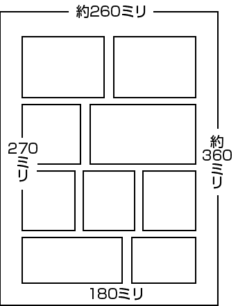 右下の図の通り。B4サイズの市販のまんが原稿用紙またはケント紙か上質紙。データ原稿の場合、記録したCD-RまたはDVD-Rを同封の上、B4サイズで印刷したものにセリフを入れてください。データ形式は600dpi、モノクロ2階調、psd ファイルとします。